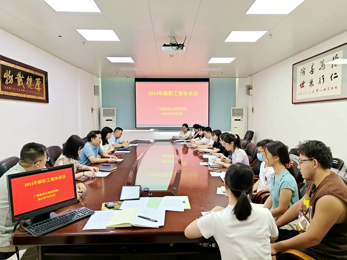 为教育和引导新职工进一步强化政治纪律、工作态度和职业规划,10月8日下午,药学院组织召开新职工集体谈话会议,党委书记文秋林、院长阳洁、副院长何萍、副院长苏志恒、部分党委委员、纪委委员及2024年新入职职工参加会议。
