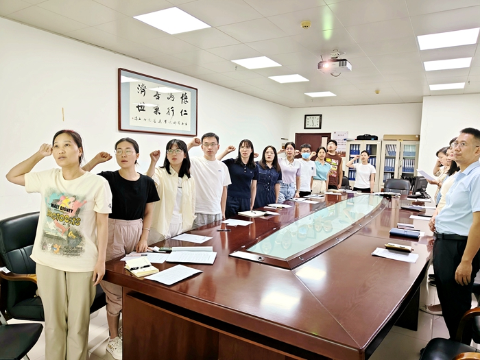 在何萍带领下,新职工一起宣读《广西医科大学入职宣誓誓词》,并分别签署《广西医科大学教师师德承诺书》《拒绝酒驾醉驾承诺书》。