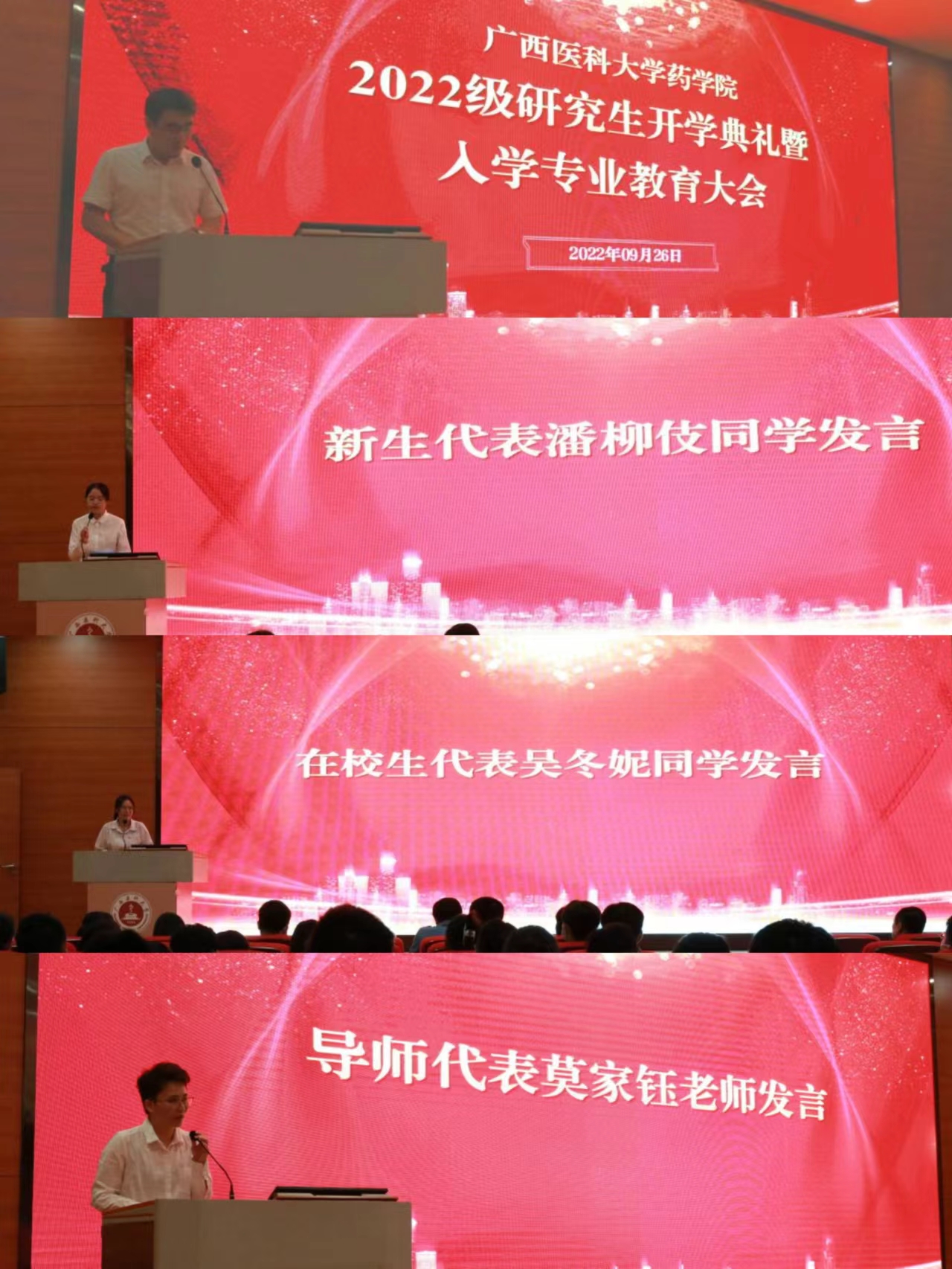 会议分为开学典礼和入学专业教育两个内容。在开学典礼中,药学院韦锦斌院长对2022级研究生的加入表示了祝贺和欢迎。韦锦斌院长强调,药学院研究生新生要志存高远,做好长远规划,做德智体美劳全面发展的药学人。接着,2022级潘柳伎同学代表全体新生发言,她表示将以发展药学为己任,修身立德。2020级在校生代表吴冬妮同学和新生分享了研究生的学习生活体会,鼓励师弟师妹们应勤思苦学,科研之余综合发展。教师代表莫家钰老师向同学们分享了个人的科研经历与体会,她希望同学们能做好人生规划,做好迎接困难的一切准备,逆流而上,乘风破浪!