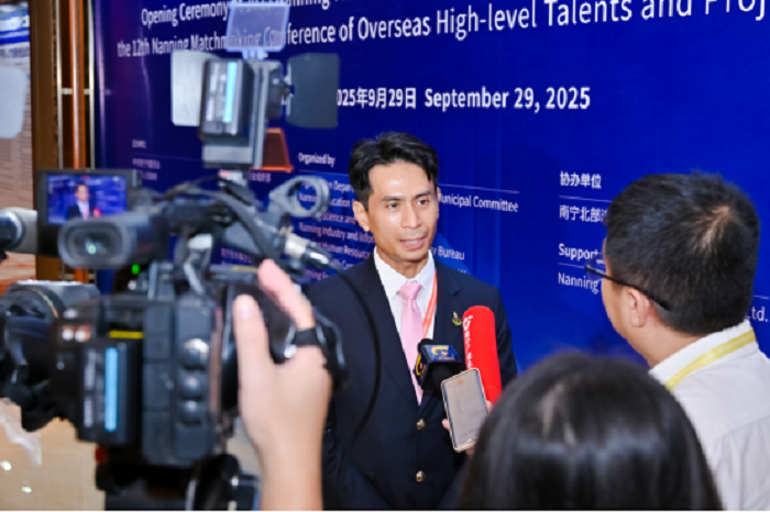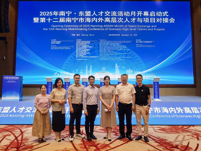 9月29日,在“2025年南宁·东盟人才交流活动月”开幕启动式上,广西医科大学药学院院长阳洁、朱拉隆功大学药学院副院长Chatchai Chaotham及广西白云山盈康药业有限公司党总支书记黄平权共同签署了“人工智能驱动的广西特色药用资源活性成分精准挖掘与高值健康产品联合开发研究”重大人才项目合作协议。该项目充分发挥广西医科大学、朱拉隆功大学两校在中国-东盟特色药用资源开发领域的优势研发基础以及广西白云山盈康药业有限公司的产业转化能力,引入人工智能前沿技术,有望加速产学研协同攻关,推动面向东盟的国际药学人才高地建设。开幕式后,朱拉隆功大学药学院副院长Chatchai Chaotham接受了广西日报、南宁日报、南宁电视台等多家媒体的采访。