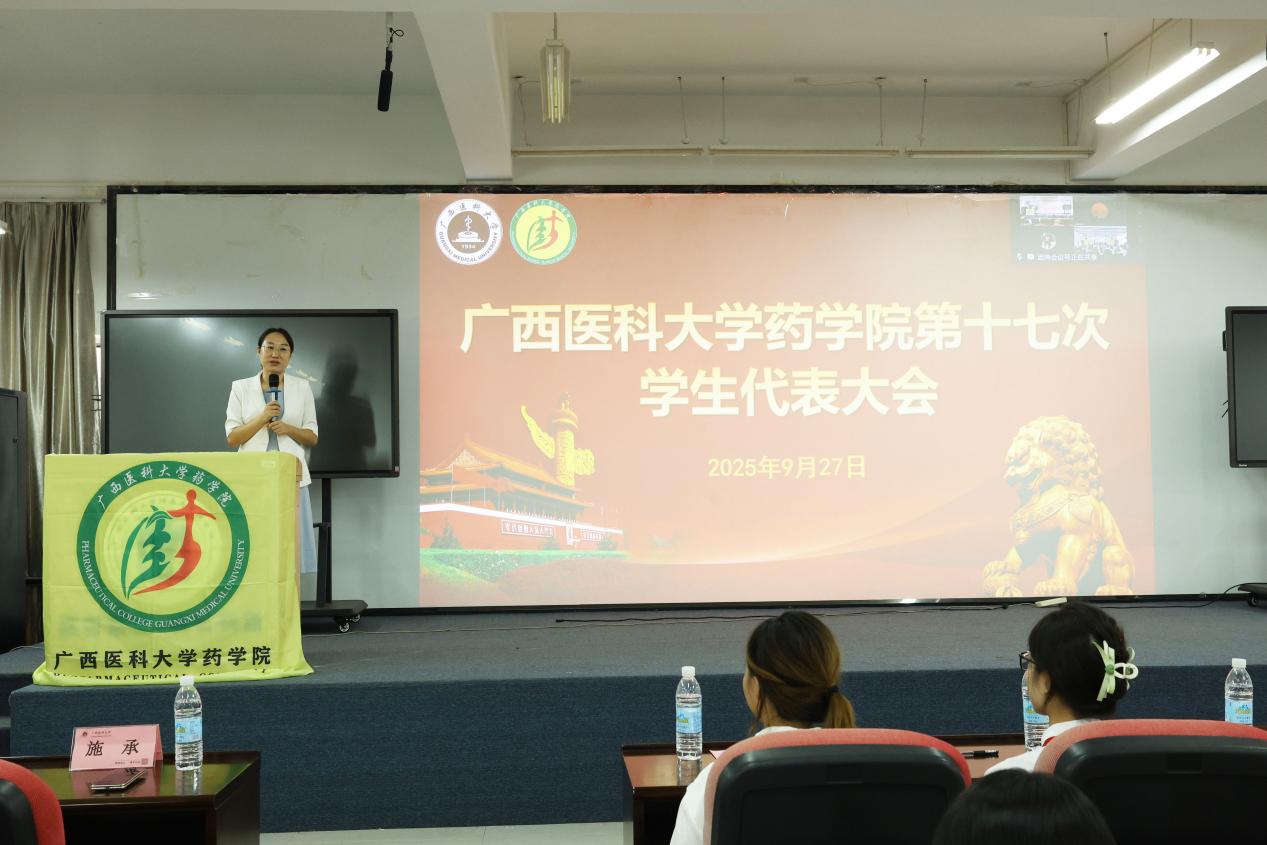 9月27日下午15:00,广西医科大学药学院第十七次学生代表大会在主会场武鸣校区A8-1-301会议厅和分会场校本部药基楼1310报告厅同时召开。药学院党委副书记林晓、团委书记施承、学工办刘乃钰老师以及70名学生代表共同参加本次会议。会议由陈品松同学主持。