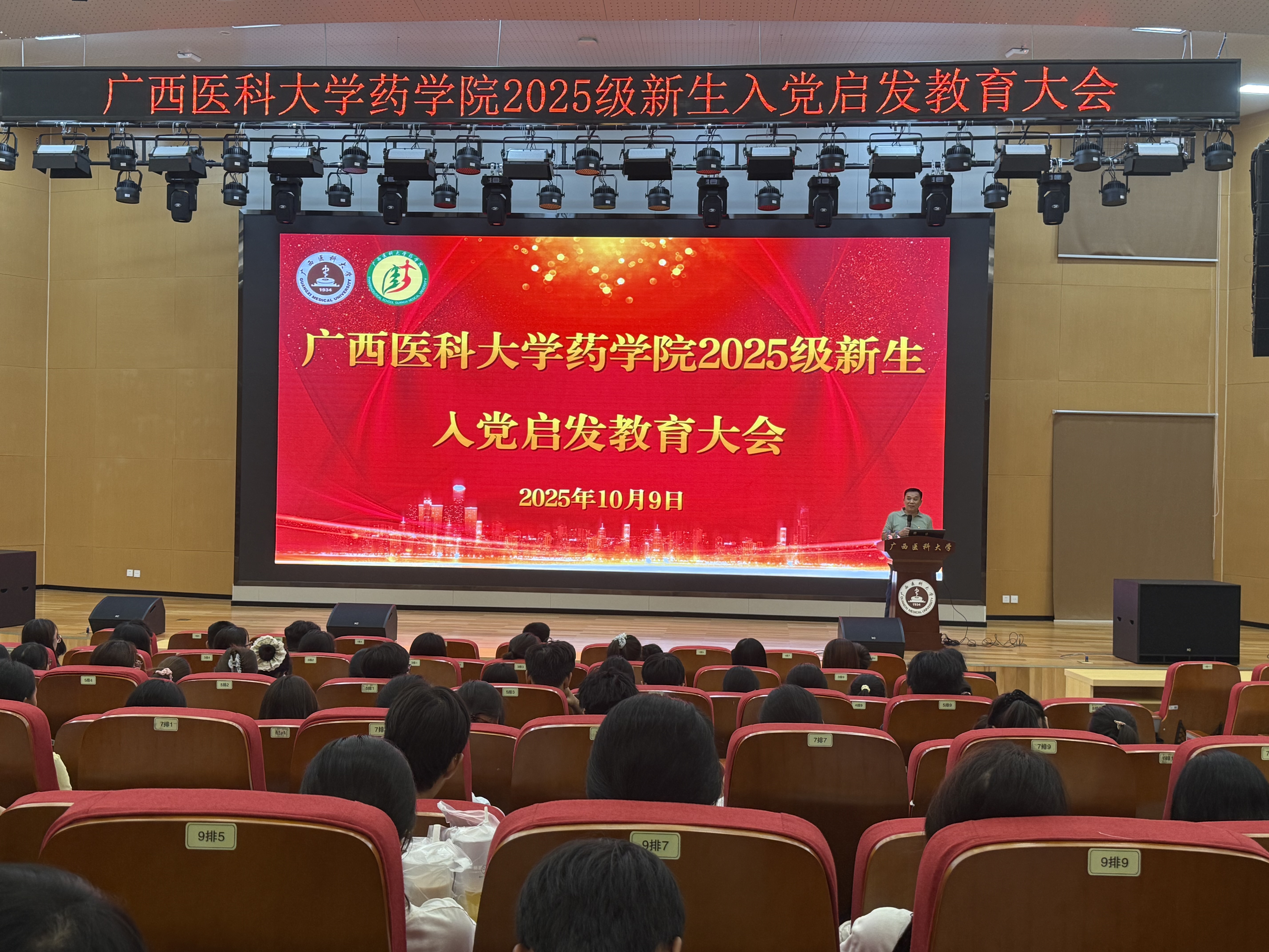 为引导青年大学生积极向党组织靠拢,10月9日晚,药学院在武鸣校区图书馆鼎新报告厅举行2025级本科生入党启发教育大会。学院党委书记文秋林、学工办胡承光老师以及373名本科新生参加会议,会议由胡承光主持。