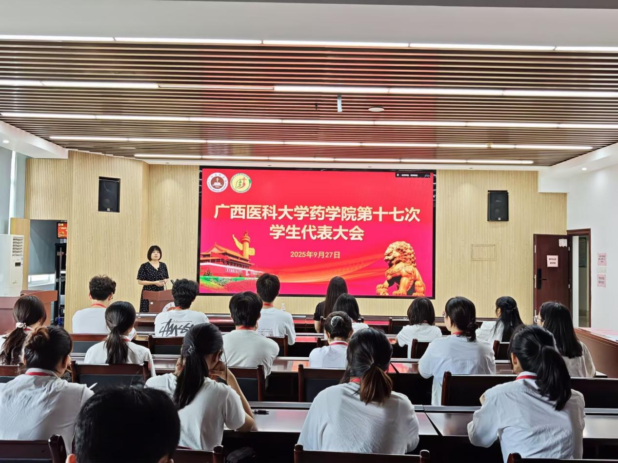 9月27日下午15:00,广西医科大学药学院第十七次学生代表大会在主会场武鸣校区A8-1-301会议厅和分会场校本部药基楼1310报告厅同时召开。药学院党委副书记林晓、团委书记施承、学工办刘乃钰老师以及70名学生代表共同参加本次会议。会议由陈品松同学主持。