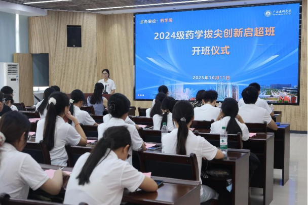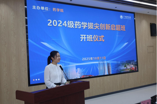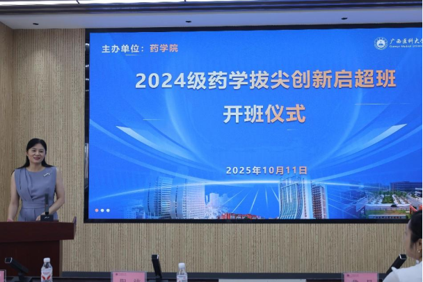 开班仪式上,教务处黄星在致辞中对首届学子寄予厚望,提出“守住一颗仁心、练就一身本领、干成一桩大事”的三点要求,勉励同学们夯实专业根基,胸怀远大理想。药学院阳洁则以屠呦呦先生及我校杨启超教授在青蒿素系列新药研发的创新足迹为引,生动阐述了“启超班”命名的深意与传承。她寄语新生代药学人,要直面国家和地方生物医药产业的发展需求,深耕广西丰富的民族药资源,敢于向新药研发的“无人区”进军。