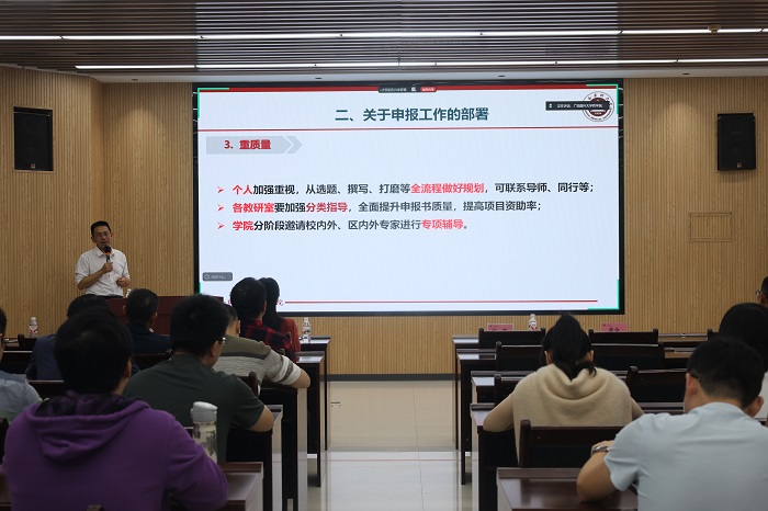 会上,苏志恒介绍了近年来学院在国家自然科学基金申报数、资助率、资助类别等方面的整体情况,指出当前取得的成绩与面临的挑战,并对学院下一步的申报工作进行部署。他鼓励全体科研人员早做准备,积极申报,力争在2026年国家自然科学基金申报立项实现新突破。
