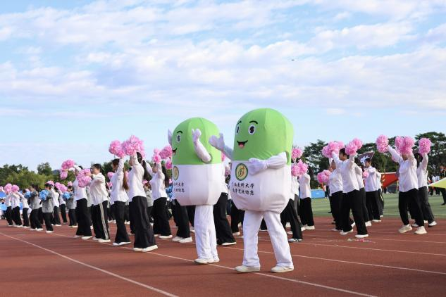 开幕式上,药学院方阵队成为一道亮丽风景。他们精神饱满,步伐整齐划一地走过主席台。方阵两侧,队员们手持花球,巧妙地摆出“91”的造型,以热情欢呼传递着对学校建校91周年的诚挚祝福。方阵中央,同学们笑容灿烂,以活力四射的舞姿尽显青春风采;方阵后方,“怀仁笃行,善药济世”的院训横幅迎风飘扬,彰显着药学院学子的精神追求。整个方阵气势昂扬,为运动会精彩开场。