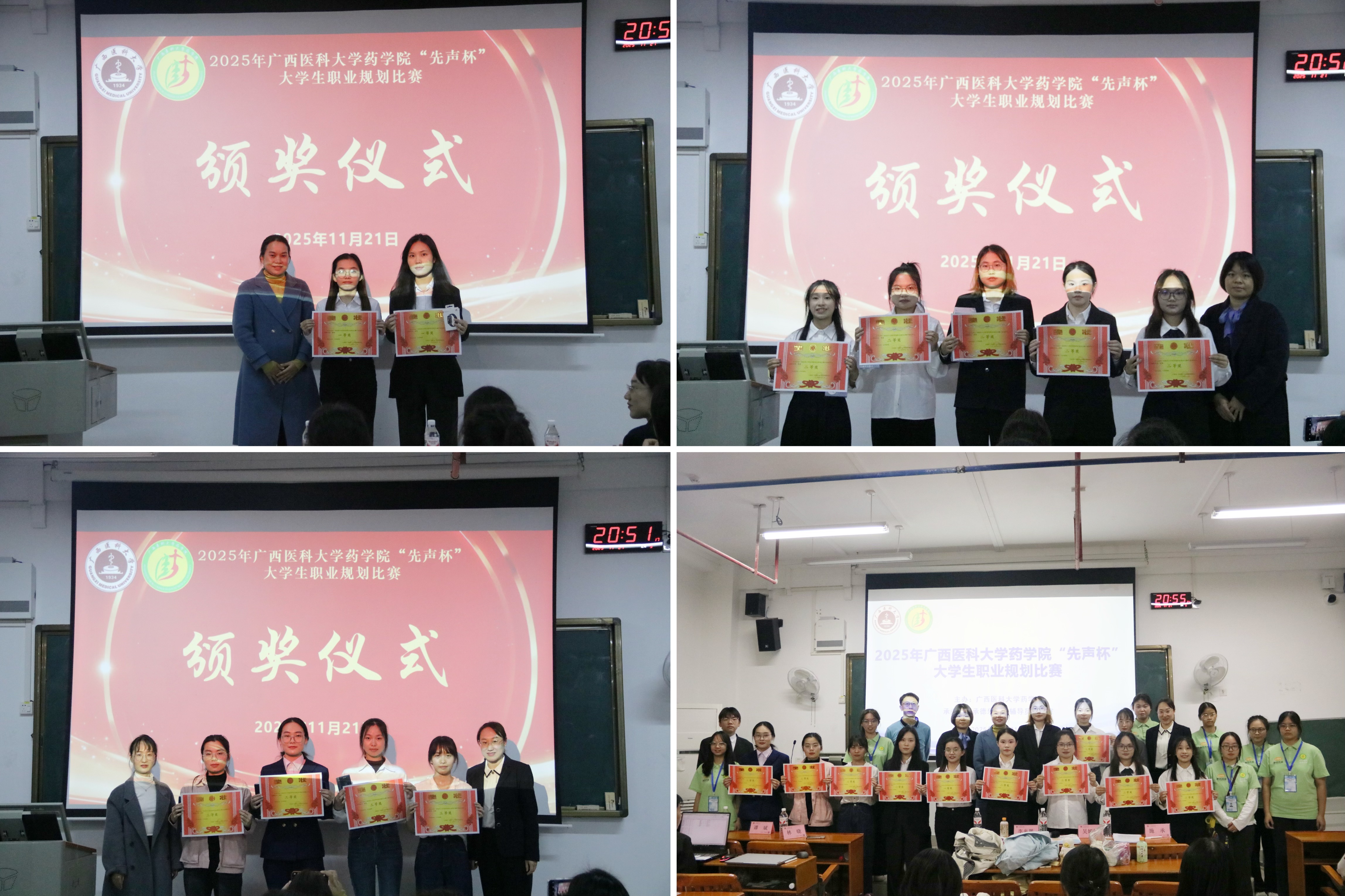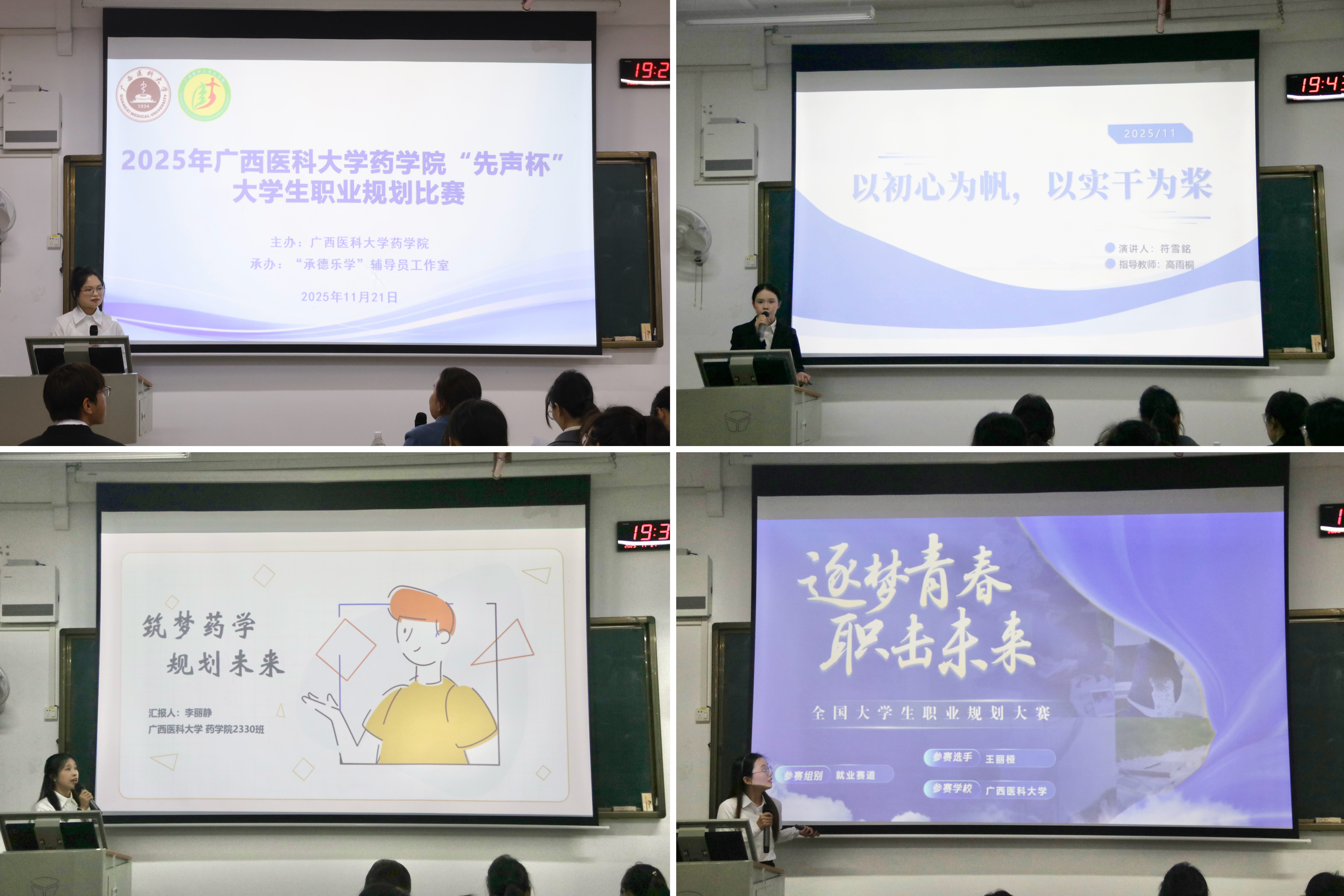 为强化大学生职业生涯规划教育,提升职业素养与能力,推动就业指导工作走深走实,11月21日晚,药学院于武鸣校区A3 - 106教室举办“先声杯”大学生职业生涯规划比赛。江苏先声药业广西OTC线负责人李光翠经理、广西医科大学附属武鸣医院药学部吴娅妮老师,药学院团委书记施承老师担任评委,药学院党委副书记林晓老师、学工办主任谭斌老师及各参赛选手共同参与本次比赛。