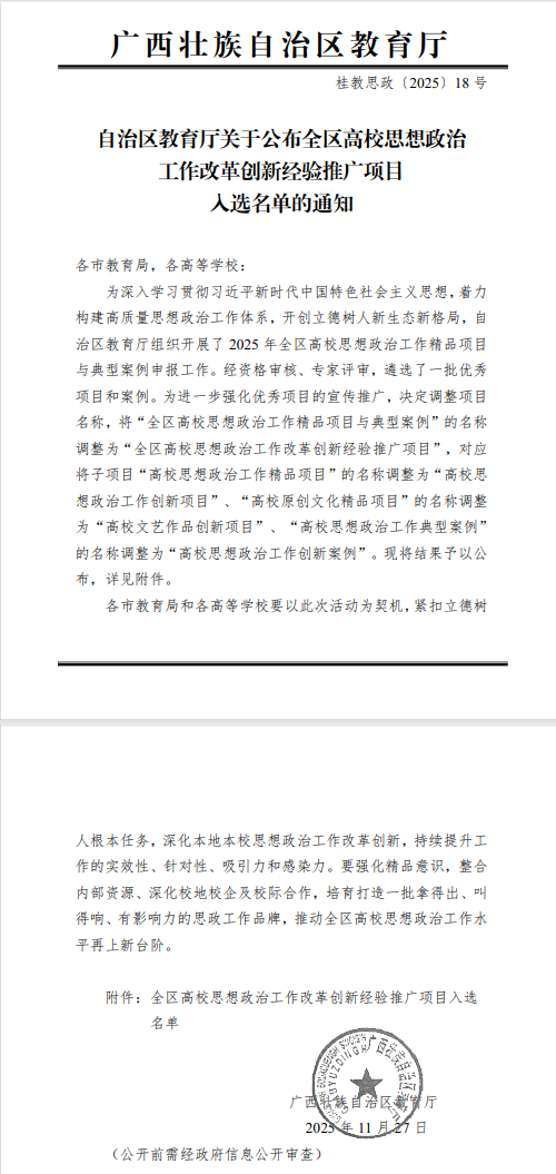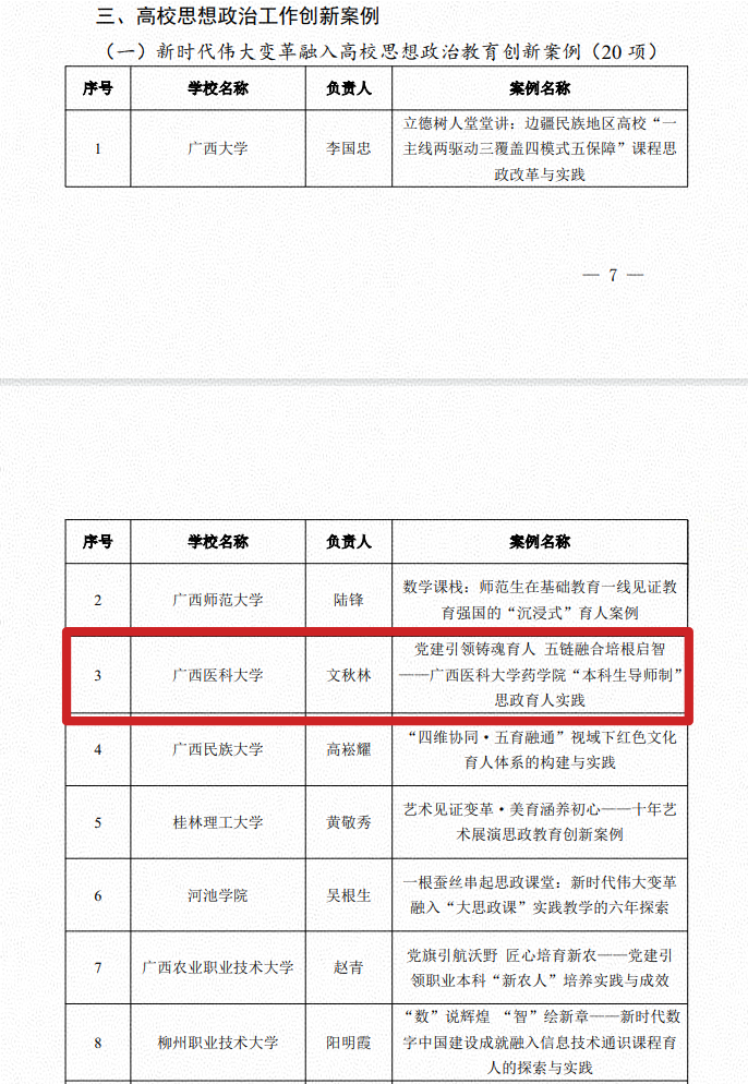 近日,广西壮族自治区教育厅正式下发《自治区教育厅关于公布全区高校思想政治工作改革创新经验推广项目入选名单的通知》(桂教思政〔2025〕18 号)。广西医科大学药学院“党建引领铸魂育人 五链融合培根启智——广西医科大学药学院‘本科生导师制’思政育人实践”项目脱颖而出,成功入选全区新时代伟大变革融入高校思想政治教育创新案例。