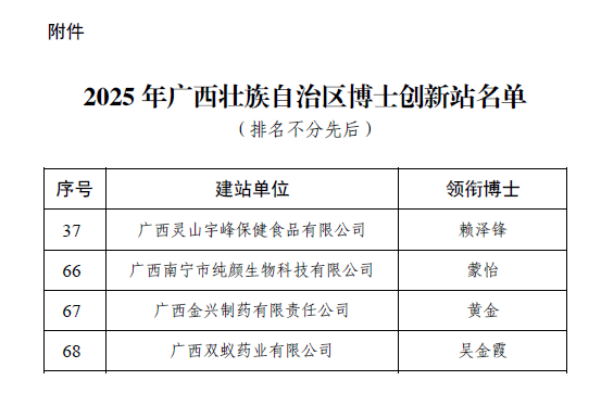 根据自治区科协、自治区党委统战部、自治区工商联《关于开展2025年广西壮族自治区博士创新站建设申报认定工作的通知》(桂科协学发〔2025〕29号)精神,经自主申报、专家评审等严格程序,我院赖泽锋博士、黄金博士、蒙怡博士、吴金霞博士领衔的四个团队获批自治区博士创新站。