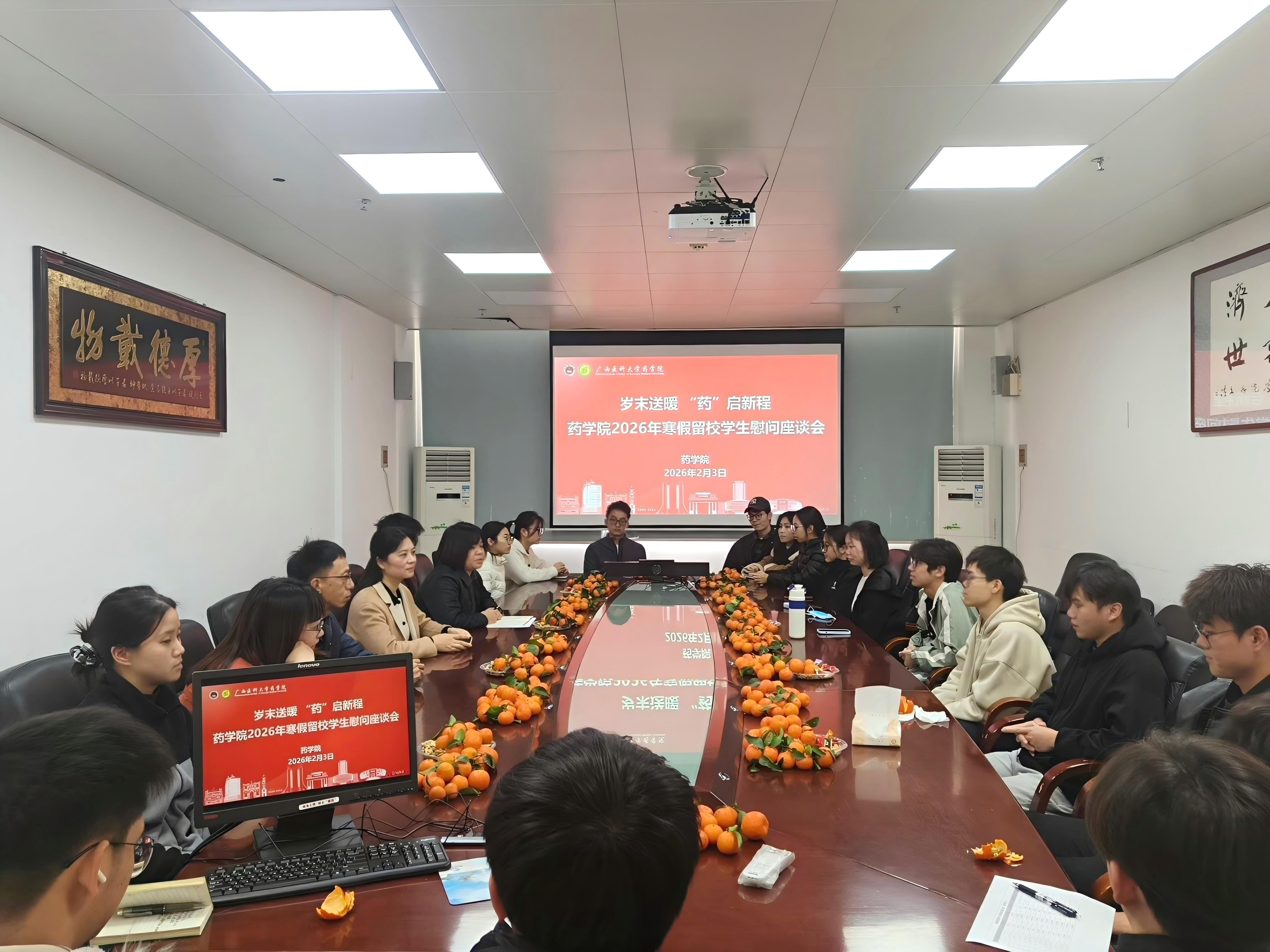 为切实做好寒假留校学生关怀与服务保障工作,2026年2月3日,药学院组织开展留校学生走访慰问活动。学院院长阳洁、党委副书记林晓带队,学工办主任谭斌、辅导员肖杰文、温宁羽、实验中心管理老师张洁一同走访实验室并举行座谈会,向在假期中仍专注学业、潜心科研的留校学子致以亲切慰问和新春祝福。