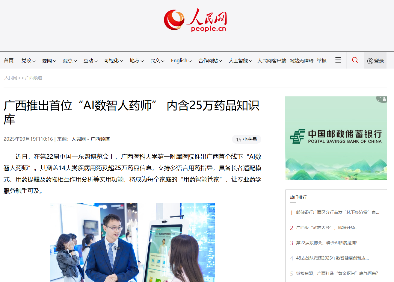 近日,人民网报道《广西推出首位“AI数智人药师” 内含25万药品知识库》