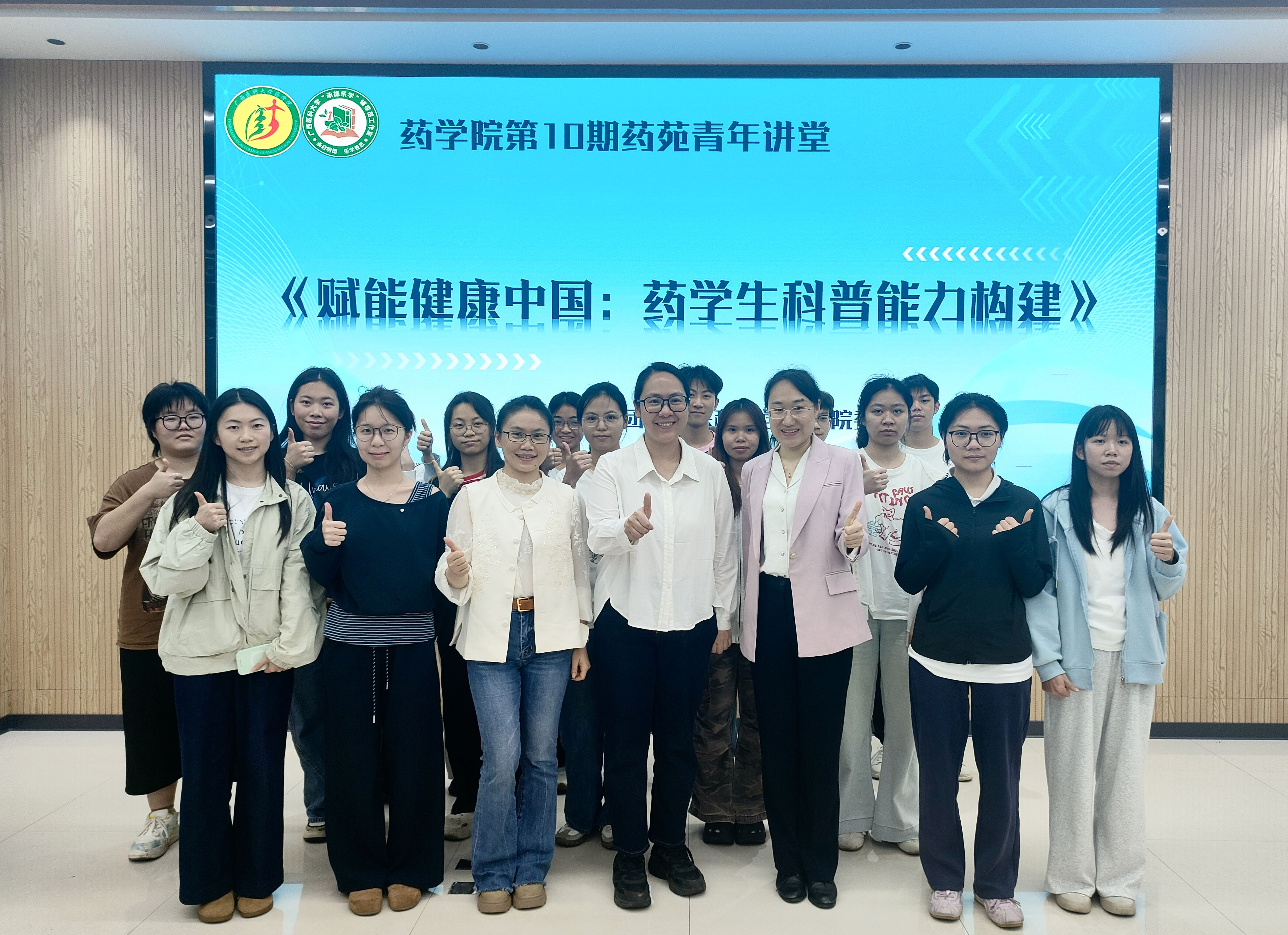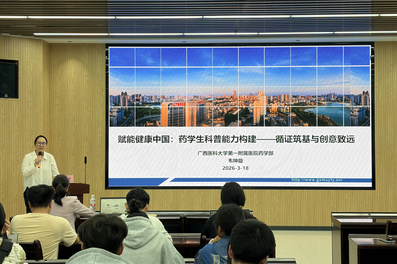 为普及合理用药知识,提升学生科普创作与健康传播能力,3月18日晚上19:00,药学院特邀请广西医科大学第一附属医院药学部主任药师韦坤璇,在校本部药基楼1310多功能厅开展专题讲座,近300名学生线上线下参与,讲座由药学院团委书记施承主持。