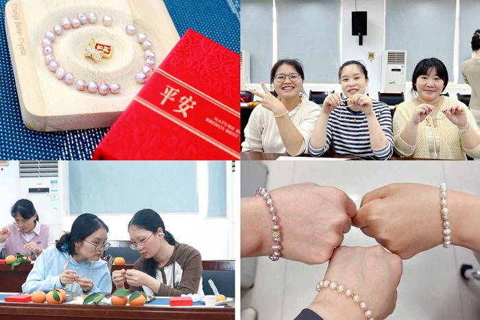 随后DIY环节中,在指导老师的细致讲解下,女教职工们挑选圆润珍珠、精致配饰,穿针引线、打结装饰,沉浸式投入手工创作。大家相互交流技巧、分享心得,现场欢声笑语交织,氛围温馨热烈。